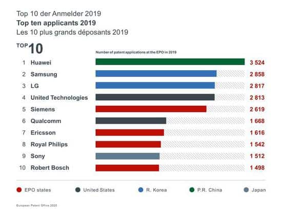 Huawei ranked first with 3,524 patent applications. Samsung and LG ranked second and third with 2,858 and 2817 respectively.