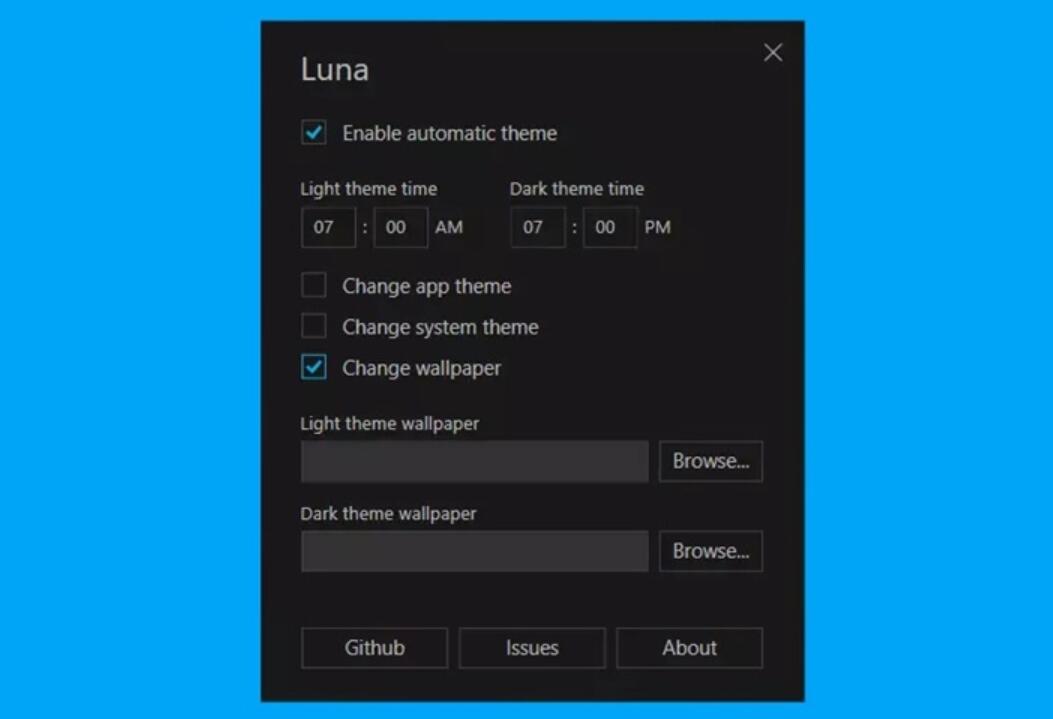 Automatically enable dark themes: This is the main feature of this tool and it works well. When you want to enable a dark or light theme, it's easy to achieve. It has a handy panel that lets you set the time.
