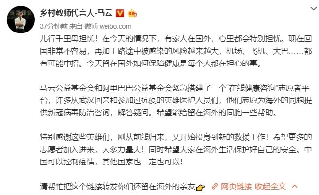 According to a personal Weibo post this morning, Jack Ma stated that the Jack Ma Foundation and Alibaba Foundation have urgently set up an "online health consultation" volunteer platform that can provide newcomer virus prevention and consultation to overseas compatriots.