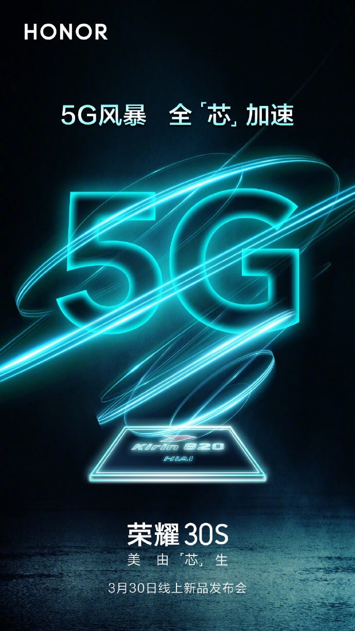 Honor announced today that a new generation of Kirin 820 5G chips will be released online with Honor 30S on March 30th. Honor 30S will also be the first mobile phone equipped with Kirin 820 5G chip.