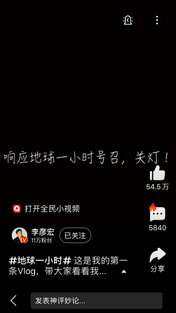 In the black Vlog on this screen, the white words "Respond to the Earth's call for an hour, turn off the lights!"