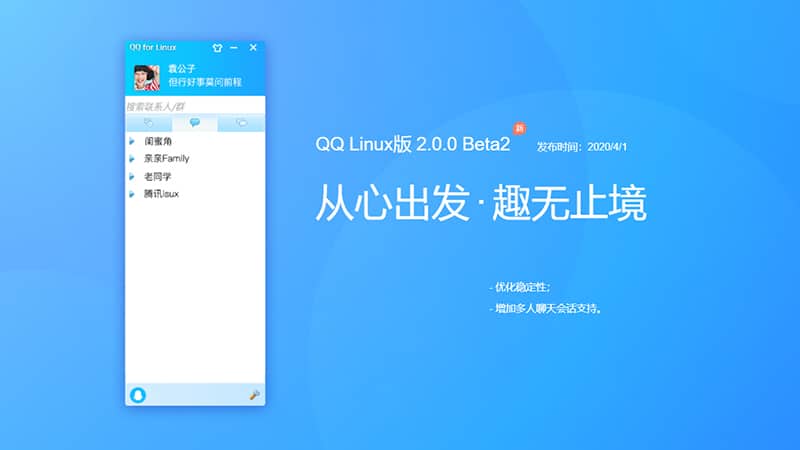 The latest v2.0.0 Beta2 version of Tencent QQ for Linux is released. The previous version v2.3.2 was released 160 days ago on October 24 last year.
