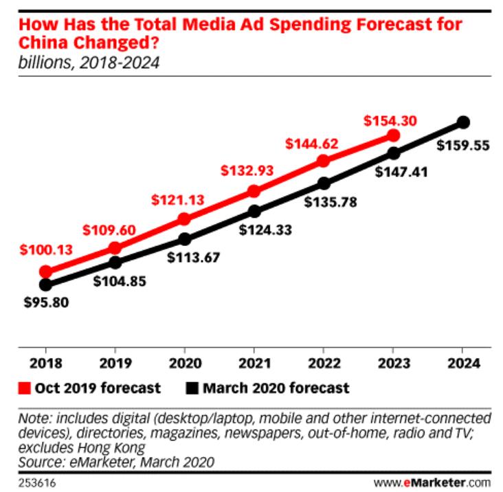 COVID-19 is having a negative impact on China's advertising expenditure, with market research firm eMarketer lowering its forecast for China's advertising spending in 2020 and beyond.