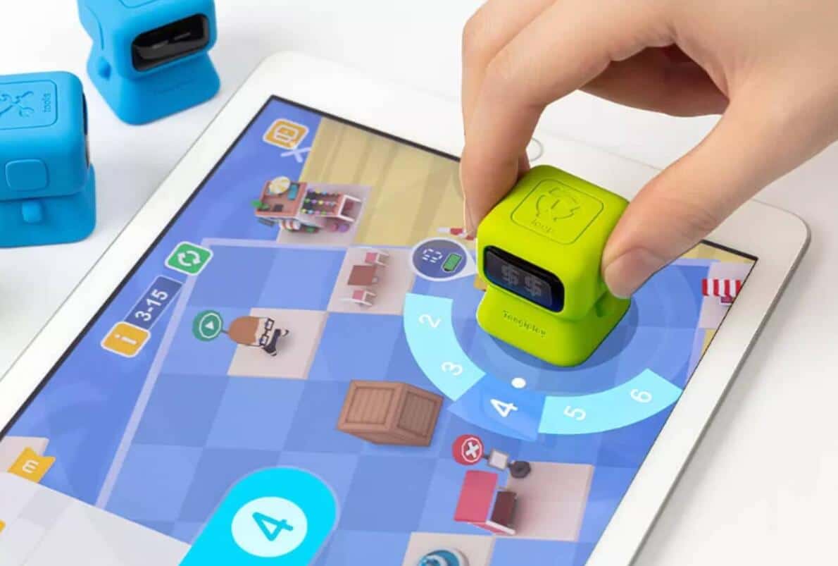 Tangiplay building blocks include 12 physically coded toys, with 20 different magnetic emoji faces, and different functional attributes based on color, such as blue for order, green for loop, yellow for function, and red for debugging.
