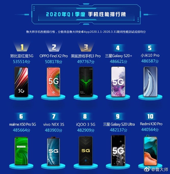 In addition, the top ten mobile phones are: Samsung Galaxy S20 + (486621 points), Xiaomi 10 Pro (486587 points), Realme X50 Pro 5G (485664 points), vivo NEX 3S (483903 points), iQOO 3 5G (482909 points) ), Samsung Galaxy S20 Ultra (482137 points), Redmi K30 Pro (440564 points).