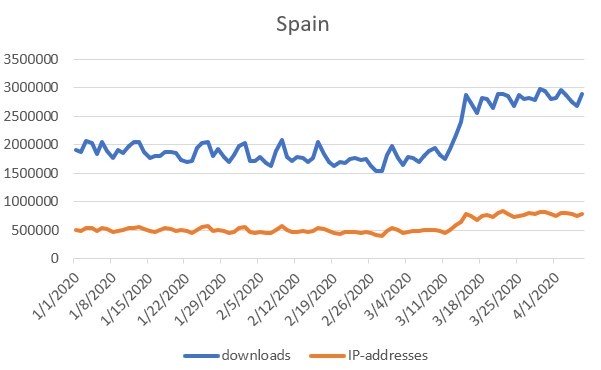 Italy implemented isolation on March 9, and the number of downloads on March 8 was 592,000. The number of IP addresses was 213,000. After a week, these two numbers increased to 810,000 and 304,000, respectively.