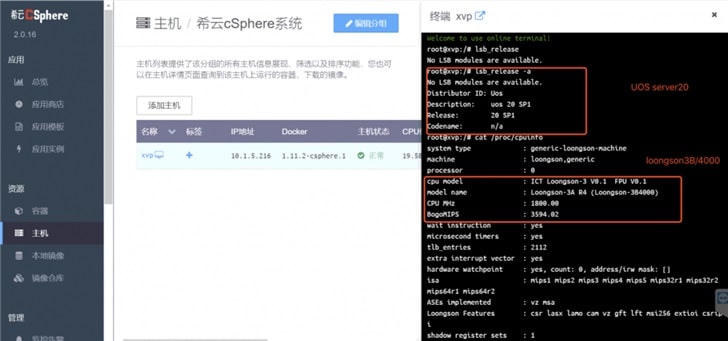 This deployment of the OA system based on the cSphere container cloud platform uses Loongson's latest generation 3B4000 server processor, which doubles the performance of the previous generation, improves memory capacity, and optimizes virtual machine efficiency.