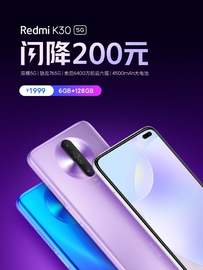 Redmi said today that the price for the Redmi K30 5G version is cut by 200 yuan (USD 28) and the 6GB+128GB version is available for 1,999 yuan (USD 282).