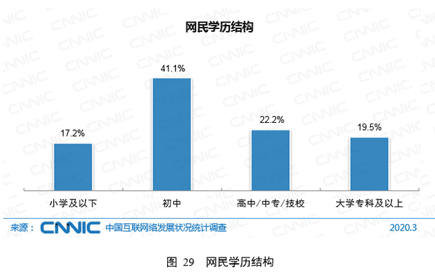 The percentage of Internet users with junior high school, high school/junior high school/technical school education is 41.1 percent and 22.2 percent respectively, while the percentage of Internet users with a college education and above is 19.5 percent.