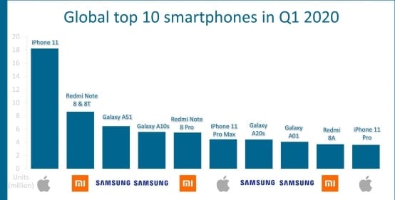 Among them, the iPhone 11 is the world's best-selling phone in Q1, with the Redmi Note8 in second place and the Samsung Galaxy A51 and Galaxy A10s in three or four places.
