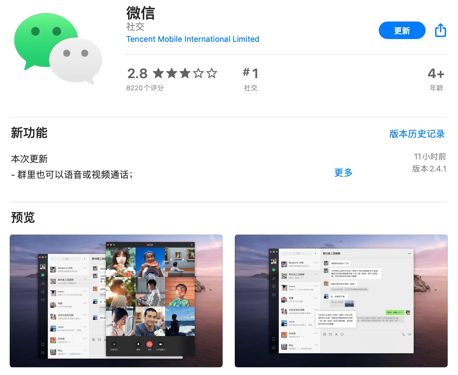 WeChat for macOS version 2.4.1 has only three updates, Apple users can finally do group audio, group video in the group, daily communication or meeting more convenient.