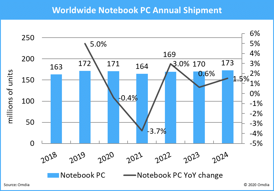 Global notebook PC shipments will rise to 171 million units in 2020, up from an original estimate of 156 million units, market research firm Omdia said in a new report.