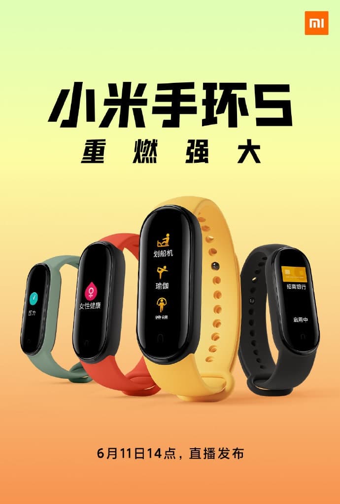 Judging by the pre-launch poster, the Xiaomi Band 5 is available in cyan, red, yellow, and black The wristband and the case are the same color. While the red and yellow case colors are black.