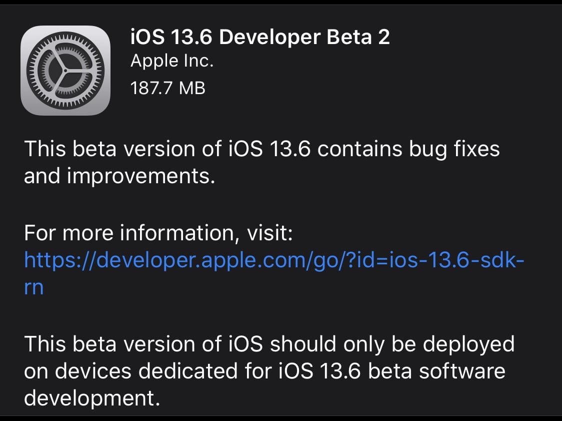 Apple released iOS 13.6 and iPadOS 13.6 Developer Previews Beta 2 today , which comes about a week after the previous update.