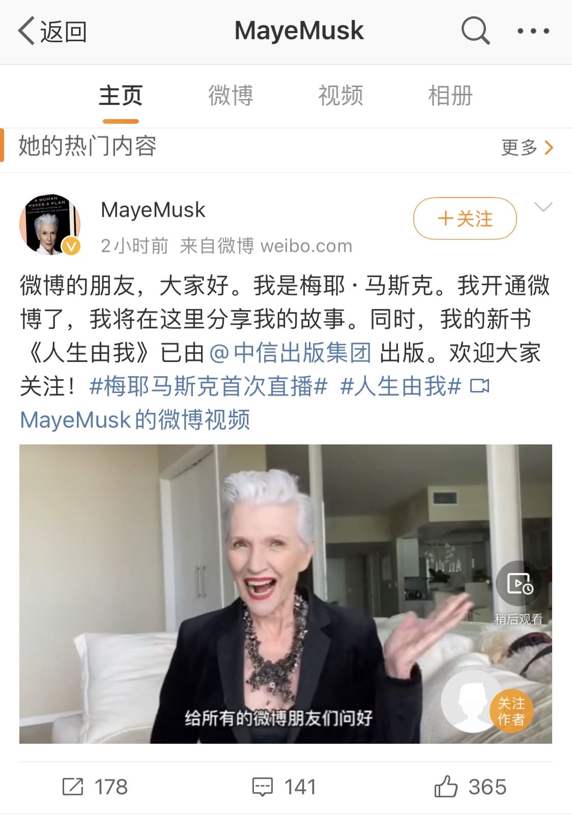 Maye is 72 years old, and her Weibo account is @MayeMusk, which is certified by Weibo as a model and registered dietitian in the United States.