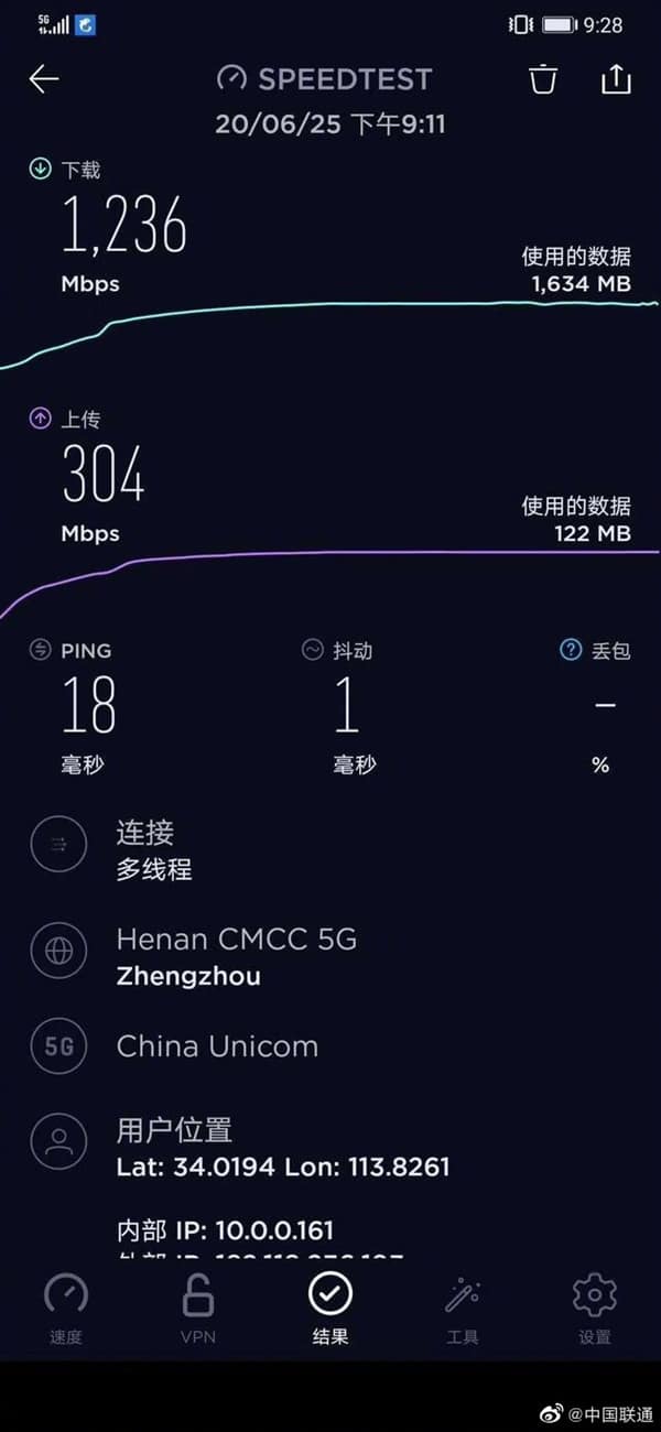 After field testing, the network has a download speed of 1.236 Gbps and an upload speed of 304 Mbps.