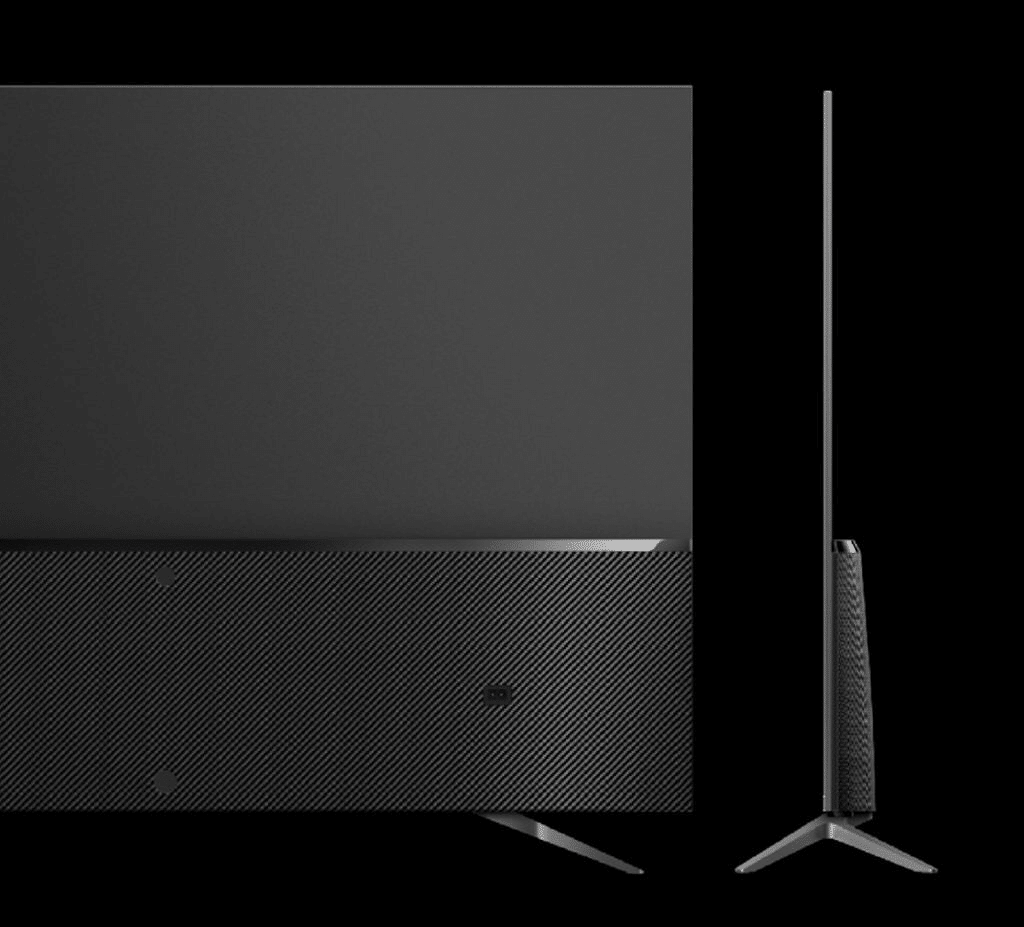 It has a thicker module on the back that hosts the motherboard, speaker assembly and ports, covered with a layer of textured carbon fiber material that allows the appearance of the TV looks premium.