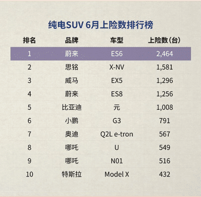 The Nio ES6, with 2,464 units insured in June, was China's best-selling electric SUV for the 10th consecutive month.