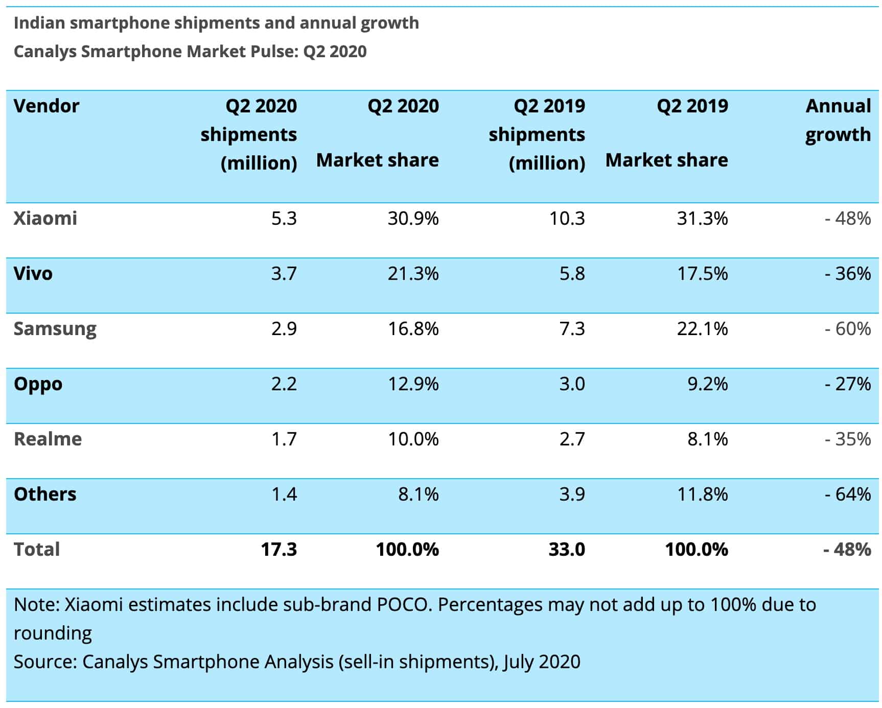 About 17.3 million smartphones were shipped in India in the second quarter of 2020, well below the 33 million units in Q2 2019 and 33.5 million in Q1 2020.