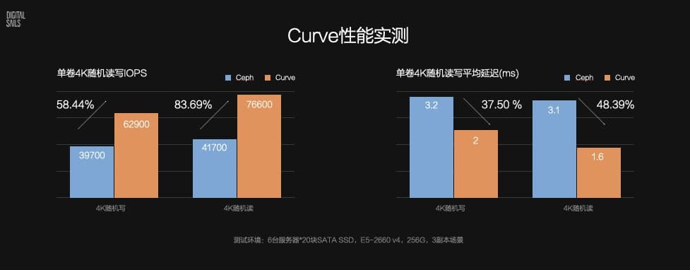 Net has published test data comparing the Curve and Ceph L versions. In a single-volume scenario, Curve's 4K random read IOPS performance is 1.84x that of Ceph and 1.58x that of Ceph's write performance. Curve's 4K random read IOPS performance is 1.84x that of Ceph, and its write performance is 1.58x that of Ceph.