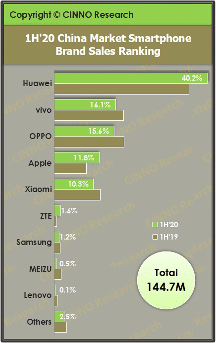 Huawei (including Honor) sold about 58 million smartphones in the first half of 2020, with a market share of 40.2 percent, up 4.9 percent year-on-year.