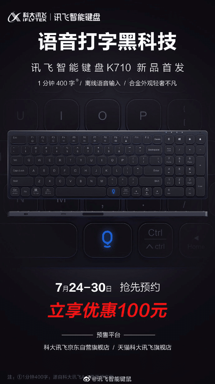 Chinese technology company iFlytek today introduced the iFlytek Smart Keyboard K710, which supports offline voice input and is claimed to allow users to type 400 words in less than a minute.