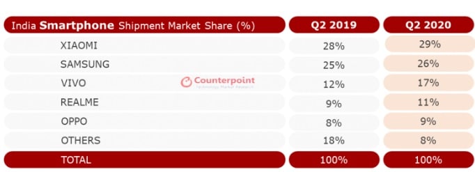 Xiaomi's share rose throughout the quarter and now stands at 29 percent, thanks to models like the Redmi Note 8.