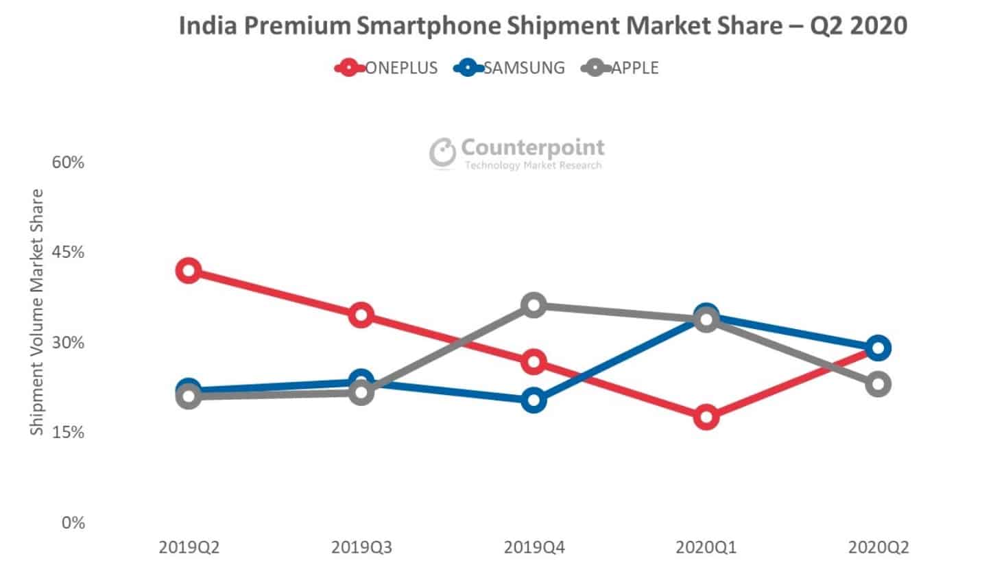 Thanks to its latest flagship OnePlus 8 series 5G and a price cut on the OnePlus 7T series, OnePlus regained its top position in the India premium smartphone market (>$400) with 29% share in the second quarter, just nudging out Samsung, according to market research firm Counterpoint.