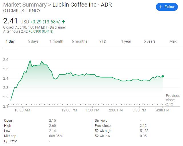 In the US Pink Sheet Market, Luckin Coffee shares rose sharply, up more than 20% at one point. At the close of trading, it was trading at $2.41 per share, up 13.68%.