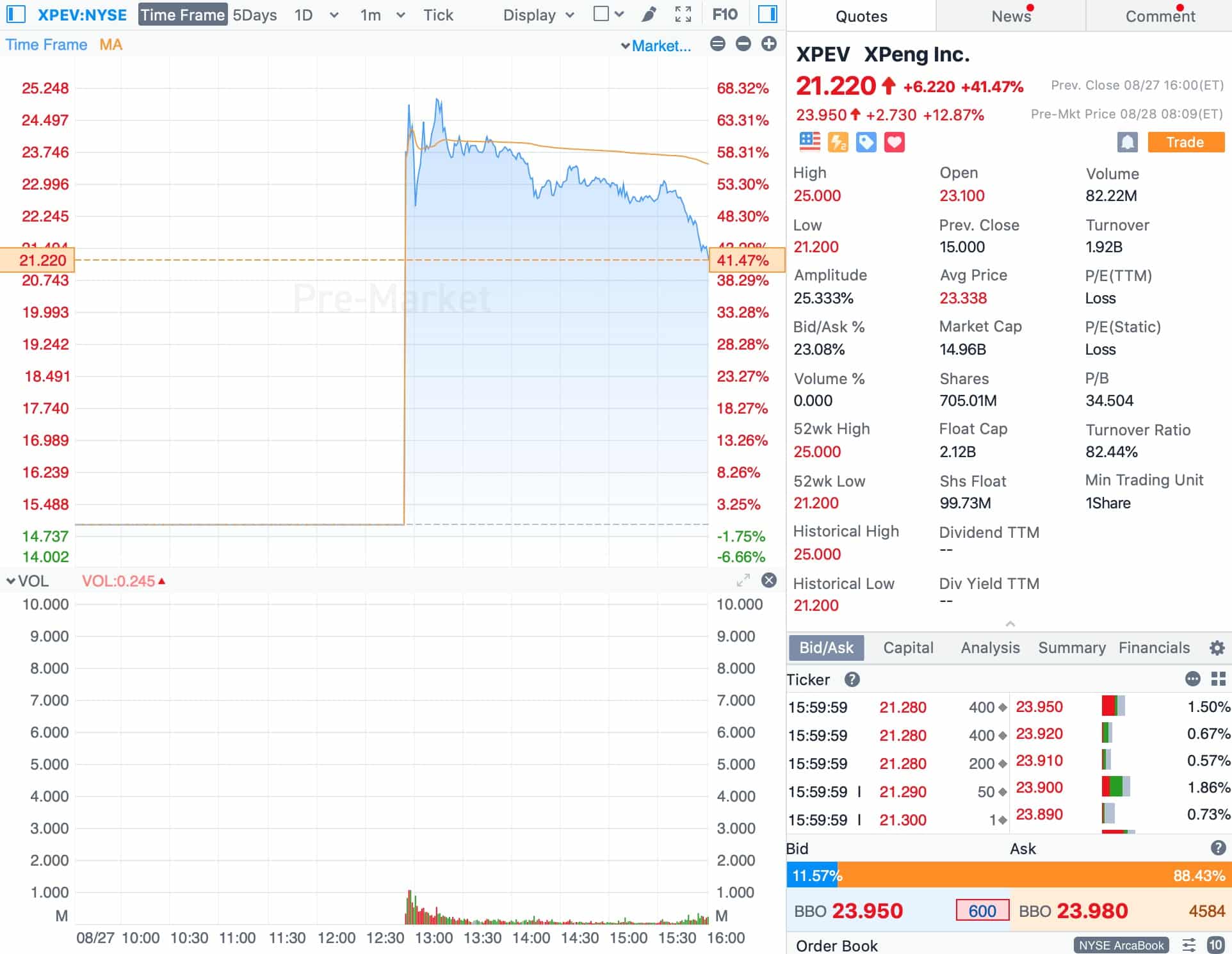 Chinese EV maker Xpeng Motors went public on August 27 on the New York Stock Exchange (NYSE), with an offering price of $15. It went up 41% on the first day of trading to reach a market capitalization of approximately $14.96 billion.