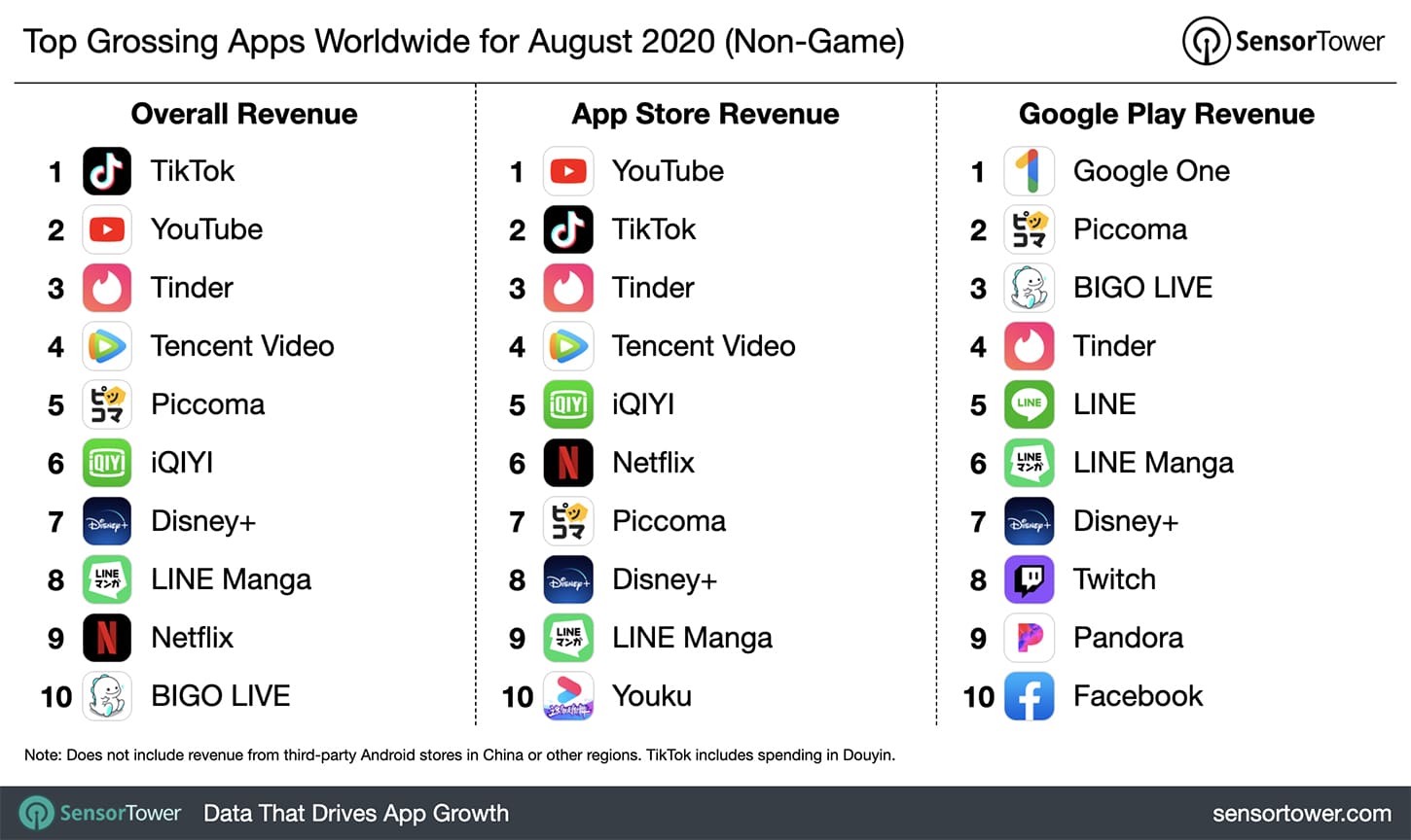 The next top grossing app was Tinder, followed by Tencent Video and Piccoma, according to Sensor Tower.