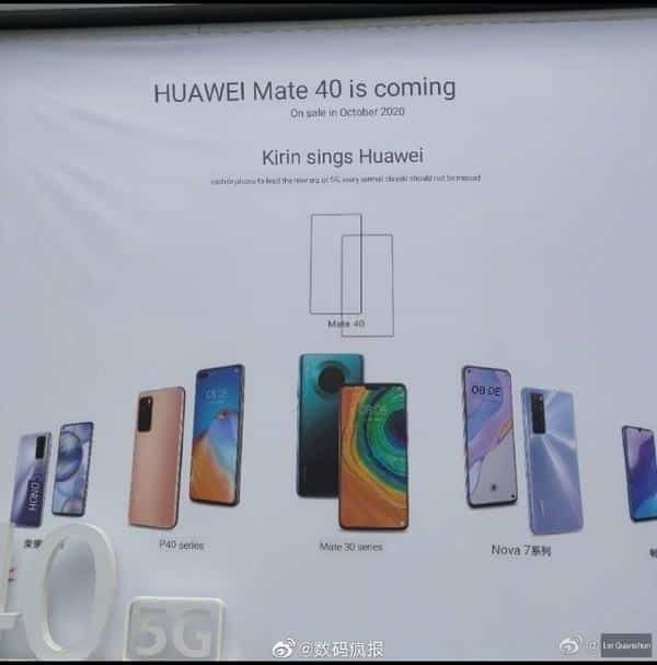 An image posted by Weibo user @数码疯报 on Saturday shows a poster for the Huawei Mate40 that reads "HUAWEI Mate 40 is coming, On sale in October 2020".