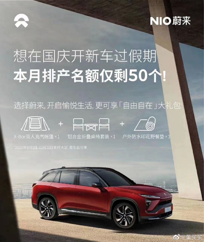 According to the poster posted by Weibo user @董买买, NIO says that if customers want to get hands-on a new car by China's National Day, they need to buy it as soon as possible, as there are only 50 spots left for production this month.