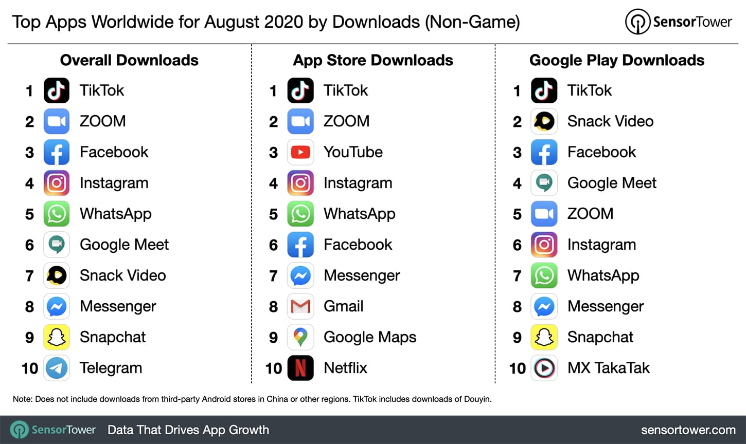 Short video sharing app TikTok was the most downloaded non-gaming app worldwide for August 2020, according to market research firm Sensor Tower.