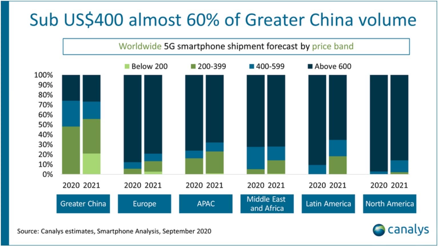 By 2021, nearly 60% of 5G smartphone shipments in China will be cheaper than US$400, while 5G penetration will reach 83% in the next 12 months, market research firm Canalys said in a recent report.
