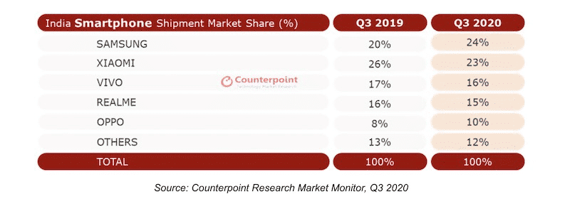 According to Canalys, another research firm, Xiaomi has the largest market share in India with 26.1 percent in the third quarter of 2020, ahead of Samsung's 20.4 percent.