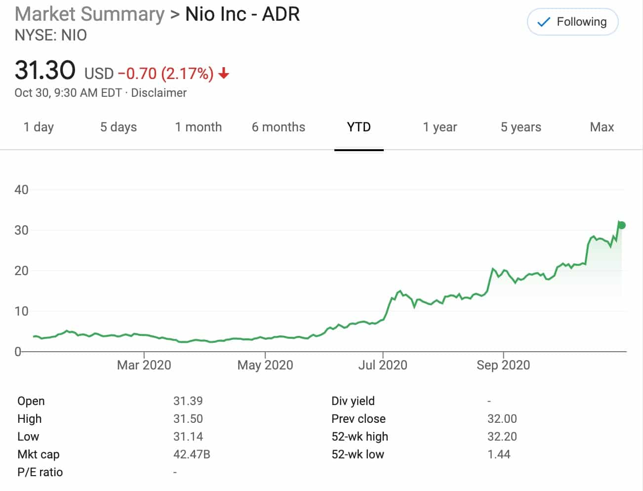 So far this year, NIO's stock is up about 600%. If you count from a low of $1.19 on Oct. 2 of last year, NIO is up a whopping 2000% over the past year, for a total market capitalization of $42 billion.