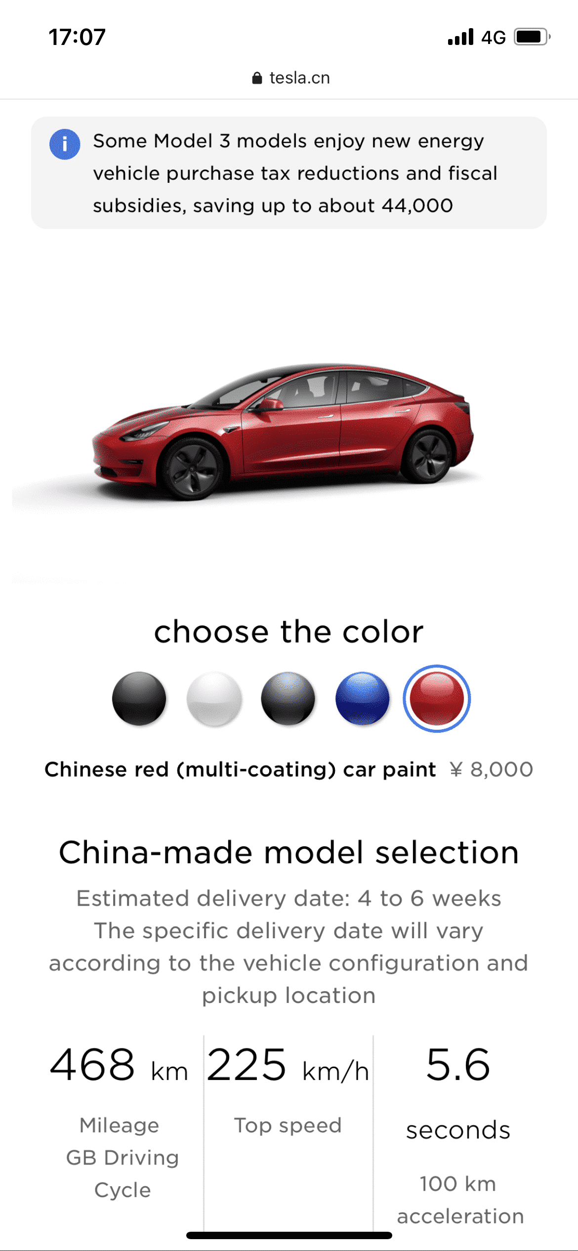 China-made Tesla Model 3 delivery date has been changed from 1-2 weeks to 4-6 weeks as customer demand soars, according to information on Tesla China's official website.