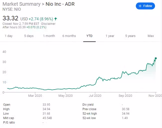 NIO shares went up by about 9 percent to trade at $33.32 as of market close on Monday.