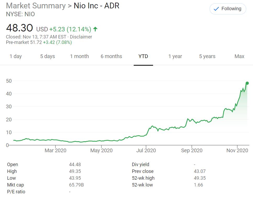 Boosted by its local peers' better-than-expected earnings report, Chinese electric vehicle (EV) maker NIO (NYSE: NIO) shares surged above $50 in the pre-market trading session on Friday, hitting a new all-time high.