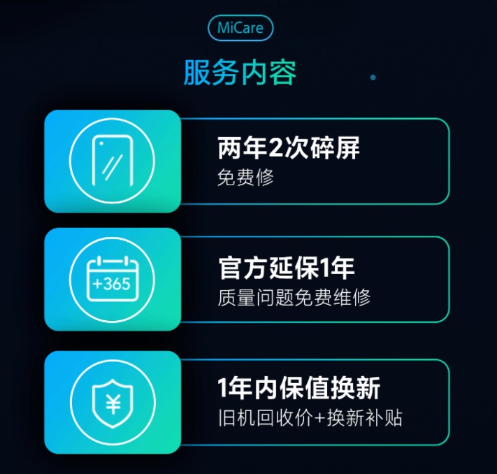 Xiaomi has launched MiCare mobile phone protection plan, which provides services including free screen replacement, value-insurance replacement, and extended warranty, and currently supports Mi 10 and Mi 10 Supreme Edition.