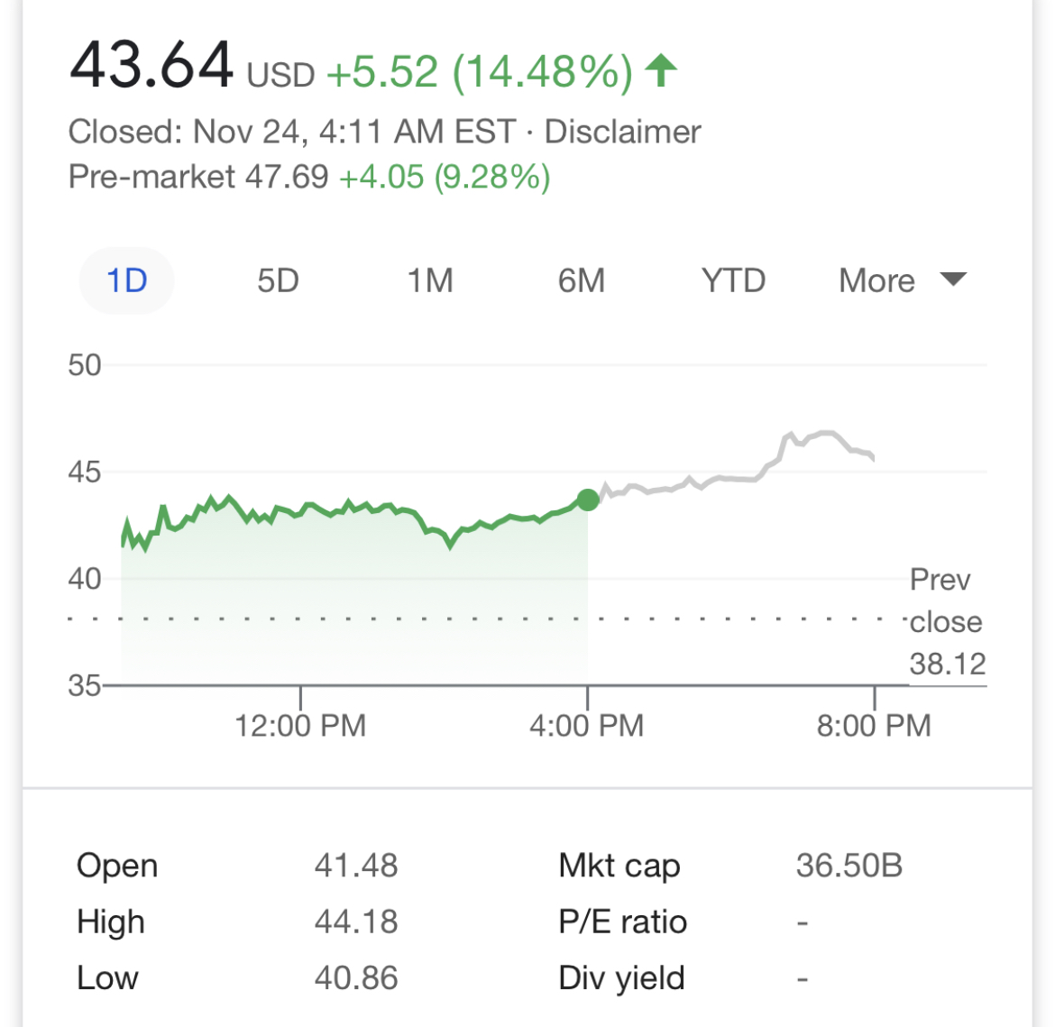 On November 23, Li Auto shares rose sharply, closing at $43.64 per share, or 14.48 percent, with a total market value of about $36.498 billion. The company was up another more than 9 percent in pre-market trading on Tuesday.
