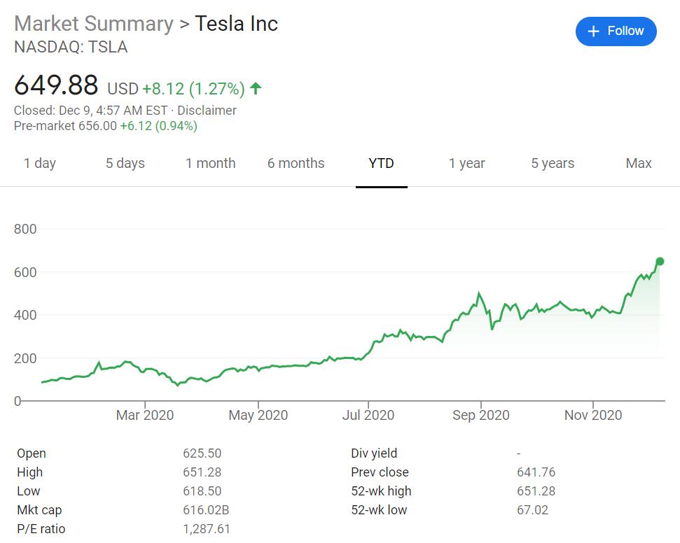 Tesla's market value has ballooned to about $616 billion, making it the sixth largest company in the US stock market and it would have more than a 1% weighting in the S&P 500.