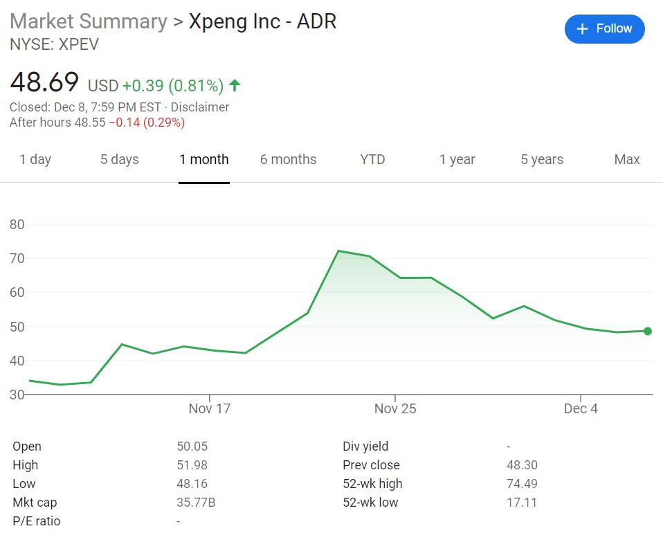 XPeng priced its follow-on offering of the ADS at $45 each, representing a 7.6% discount to its last closing price of $48.69.