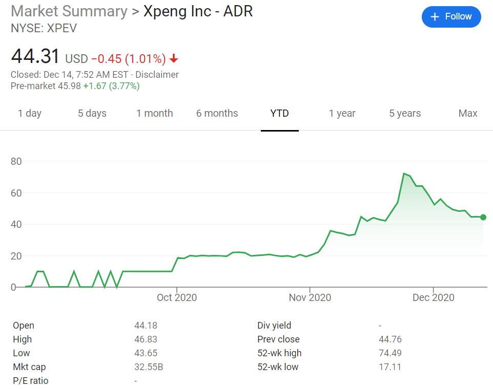 At press time, XPeng was up 3.77 percent at $45.98 in pre-market Monday.