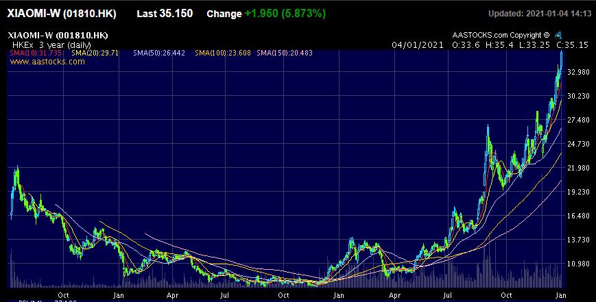 As of 2:10 p.m. Beijing Time, Hong Kong-listed Xiaomi was up nearly 6 percent to HK$35.15, up more than 100 percent from HK$17 when the company went public on July 9, 2018.