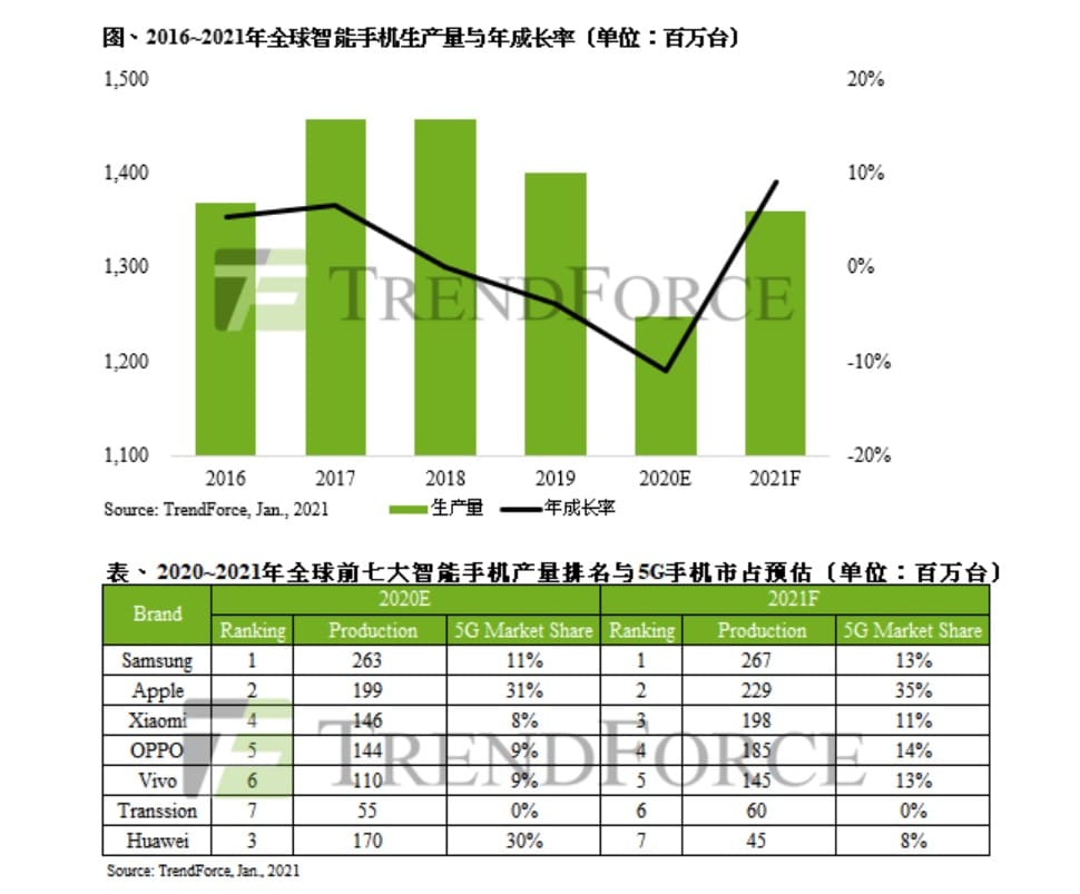 TrendForce expects the top six manufacturers to be Samsung, Apple, Xiaomi, OPPO, Vivo, and Transsion.
