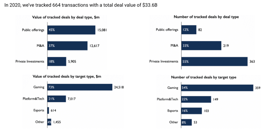 In 2020, total investment in the global gaming industry reached 664 deals with a total value of $33.6 billion, according to an annual report by market research firm InvestGame.