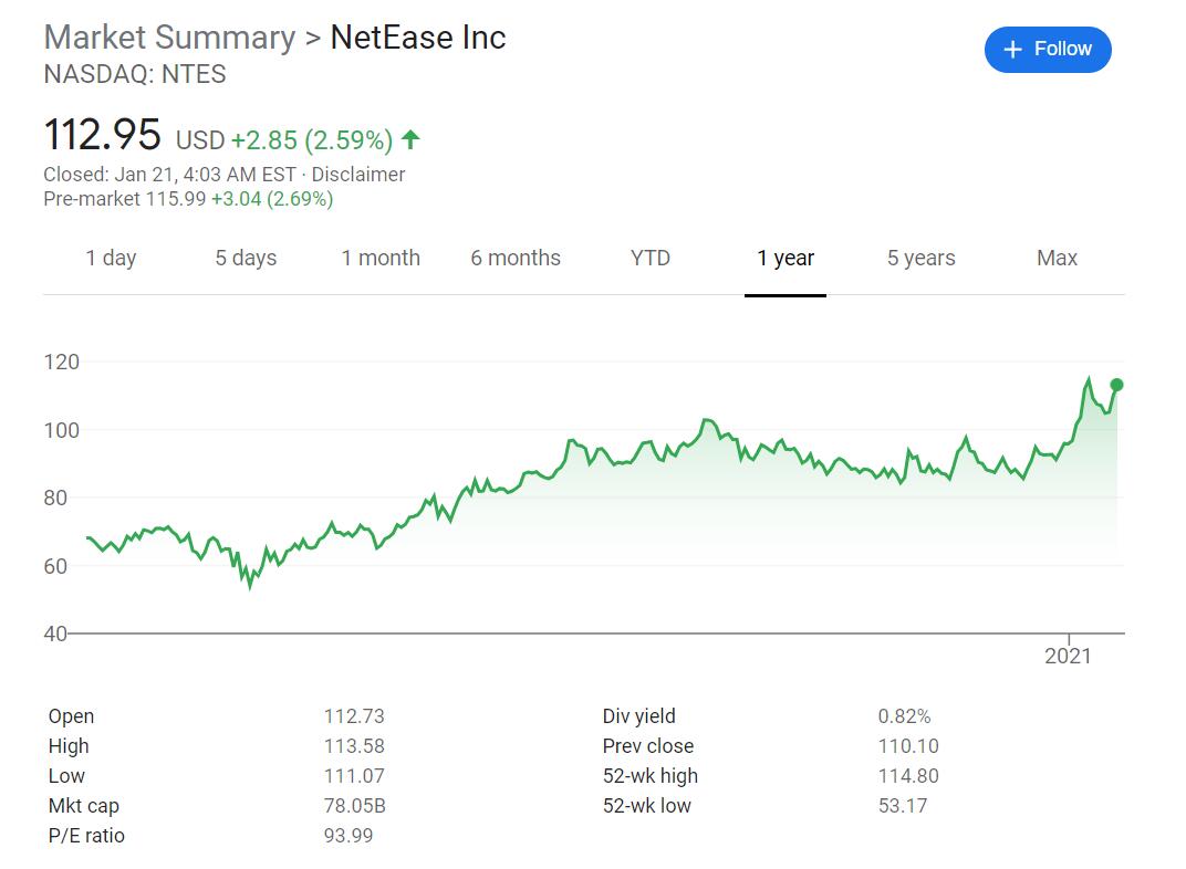 NetEase rose 2.69 percent to $115.99 in the US pre-market trading session. Its shares have risen 66 percent in the past year.