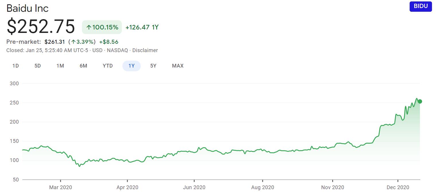 In Monday's pre-market trading session, Baidu rose 3.39 percent to $261.31.